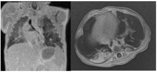 Taking advantage of the expertise in our Centre, at three months of age, an MRI was performed with contrast medium. The left lung appeared much more ventilated due to drastic reduction of the described hypodense mass, and some parenchymal consolidations with blurred, irregular margins and bronchi were still recognizable at the apical and basal segments of the left lower lobe and within the lingula. Finally, another dense area was visible in the paramediastinal region of the left upper lobe (Figure 6).
