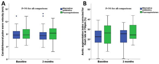 Boxplots of (A) carotid–femoral pulse wave velocity levels and (B) aortic augmentation index corrected for heart rate between patients on fluoroquinolones and patients on an alternative to fluoroquinolone antibiotics. NS: non-significant.