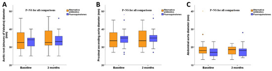 Boxplots of (A) aortic root diameters measured at the level of the sinuses of Valsalva, (B) proximal ascending aorta diameters, and (C) abdominal aorta diameters between patients on fluoroquinolones and patients on an alternative to fluoroquinolones antibiotics. NS: non-significant.