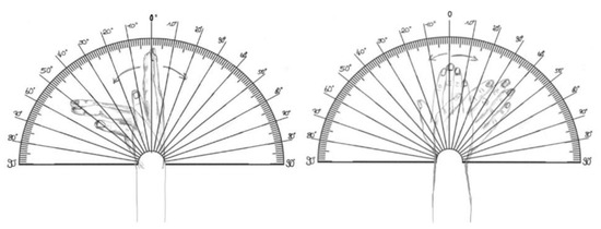 Participants were requested to provide demographic and clinical information, comprising age, sex, profession, hand dominance and any prior surgical interventions on the upper extremities. Additionally, they were instructed to complete the above-mentioned goniometer template (refer to Figure 1) to assess the ROM of their wrists. The participants were asked to place the sheet on a flat surface and position their forearm on the marked area, ensuring that the transition between the wrist and the forearm was aligned with the vertical line at 0° on the goniometer as shown on the template (see Figure 1). Depending on the movement, the hand was placed on the sheet either with the palmar surface (for radial and ulnar abduction) or with the ulnar lateral side. They were asked to move their wrist to its maximum range in both directions while keeping their fingers extended. These measurements were carried out in gravitationally unloaded conditions.