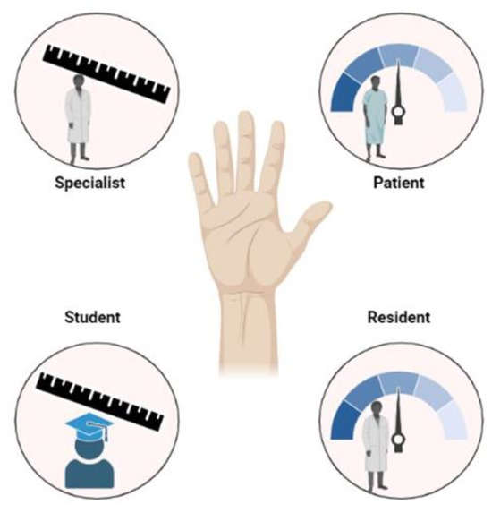 Descriptive statistics were expressed as median, standard deviation, and range. A paired t-test was used for comparison of academic vs. non-academic patients. A p value < 0.05 was considered significant. The comparison of the measurements carried out by the student, resident, specialist, and the patients was analyzed via one-way ANOVA or Friedman test, as appropriate. We used Tukey’s multiple comparisons test as post hoc tests between all four measurements. Statistical analysis was conducted with GraphPad Prism 9.0 (GraphPad Software Inc., La Jolla, CA, USA).