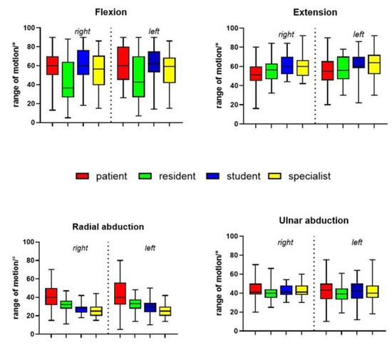The difference in mean deviations from the significant results to the examiners’ measurements was small between academics and non-academics: 7.1° for radial abduction (n = 3), 5.7° for extension (n = 2) and 5.2° for flexion (n = 2).