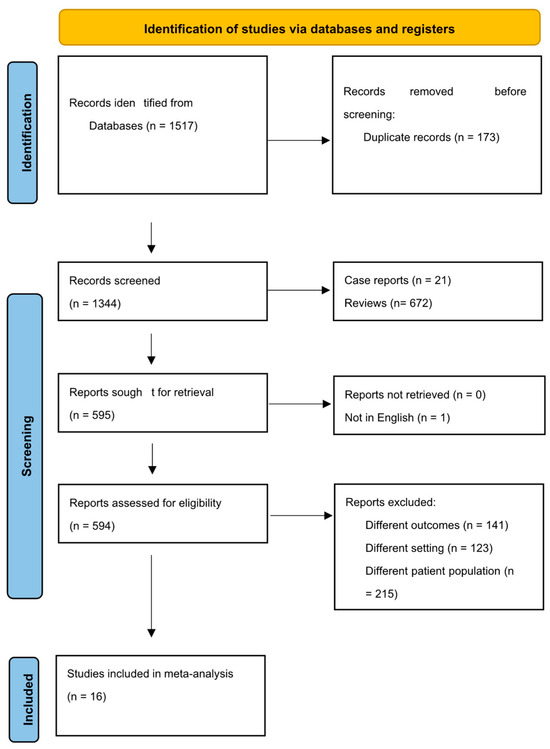 The initial search resulted in 1517 studies. Thereafter, a total of 1344 studies were retrieved after the duplicates were removed using a systematic review accelerator (SRA) [20]. Following screening, 595 articles were selected for full-text review. Finally, 16 studies were selected for the meta-analysis after applying the inclusion and exclusion criteria [2,21,22,23,24,25,26,27,28,29,30,31,32,33,34,35]. The study selection flowchart (preferred reporting methods for systematic review and meta-analysis) is shown in Figure 1.