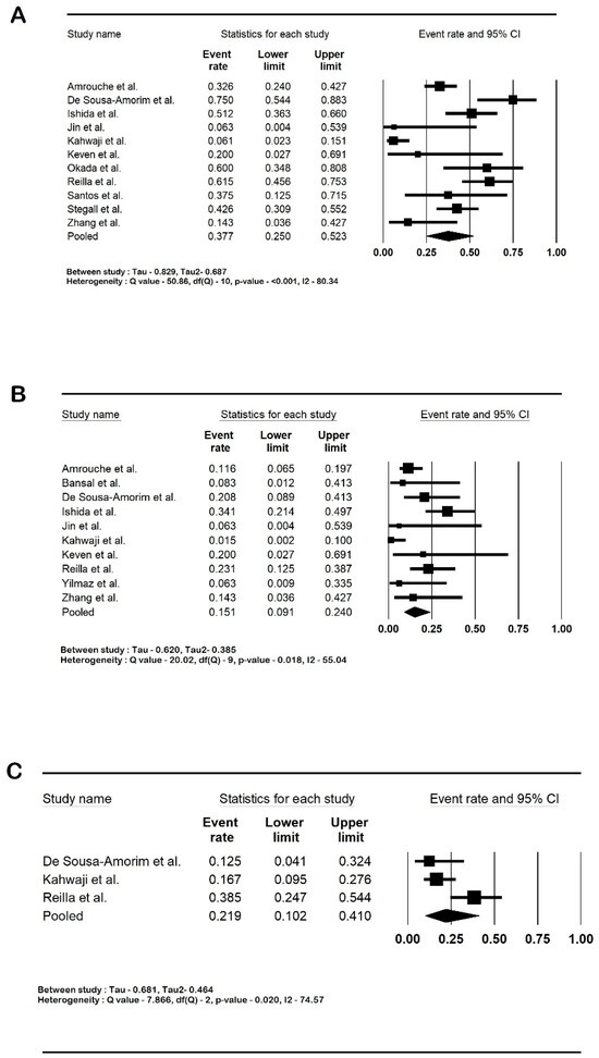 Forest plots: (A). antibody-mediated rejection; (B). acute cell-mediated rejection; and (C). transplant glomerulopathy. Amrouche et al. [2], Bansal et al. [21], De Sousa-Amorim et al. [22], Ishida et al. [23], Jin et al. [24], Kahwaji et al. [25], Keven et al. [26], Okada et al. [28], Reilla et al. [29], Santos et al. [30], Stegall et al. [31], Yilmaz et al. [33] and Zhang et al. [35]. Abbreviation: CI, confidence interval.