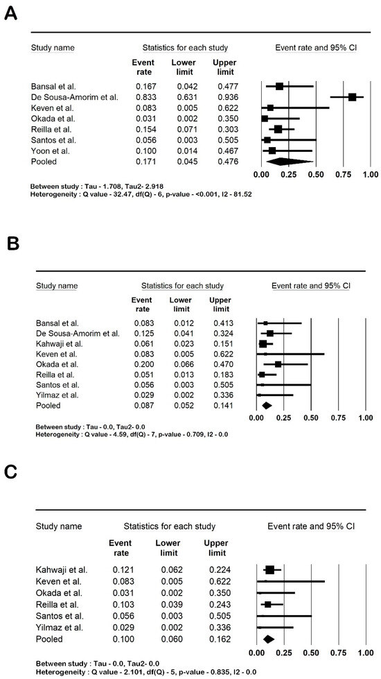 Forest plots of infections: (A). urinary tract infections (UTI); (B). cytomegalovirus infections (CMV); and (C). BK polyoma nephropathy. Bansal et al. [21], De Sousa-Amorim et al. [22], Kahwaji et al. [25], Keven et al. [26], Okada et al. [28], Reilla et al. [29], Santos et al. [30], Yilmaz et al. [33] and Yoon et al. [34]. Abbreviation: CI, confidence interval.