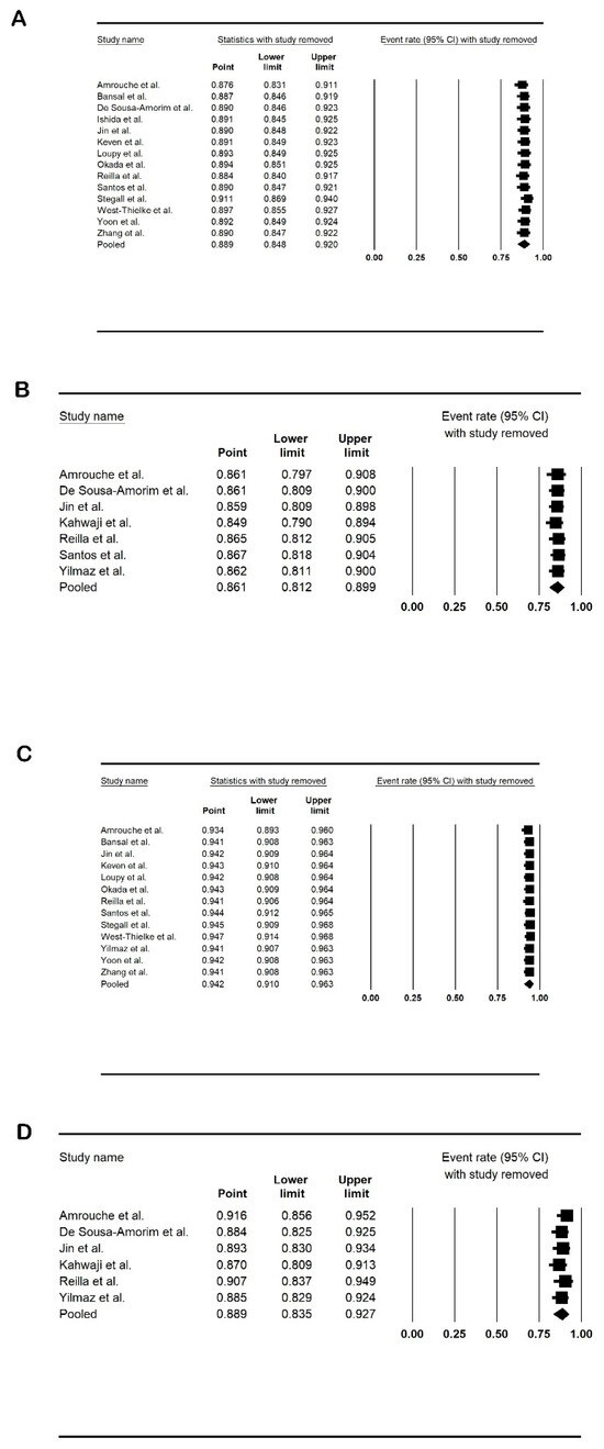 Forest plots of sensitivity analysis: (A). 1-year graft survival; (B). 5-year graft survival; (C). 1-year patient survival; and (D). 5-year patient survival. Amrouche et al. [2], Bansal et al. [21], De Sousa-Amorim et al. [22], Ishida et al. [23], Jin et al. [24], Kahwaji et al. [25], Keven et al. [26], Loupy et al. [27], Okada et al. [28], Reilla et al. [29], Santos et al. [30], Stegall et al. [31], West-Thielke et al. [32], Yilmaz et al. [33], Yoon et al. [34] and Zhang et al. [35].