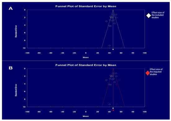 Funnel plots for the analysis of publication bias: (A). only the included studies, with Egger’s test for a regression intercept giving a one-tailed p-value of 0.029, indicating evidence of publication bias (the intercept (B0) is −2.349, 95% confidence interval (−4.80, 0.102), with t = 2.05, df = 14, and the two-tailed p-value is 0.059); (B). both the included and imputed studies by the “Trim and Fill” method, whereby, with the imputed studies, the effect size did not differ significantly from the previous effect size.
