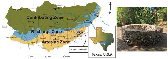 (left) Map of the Edwards Aquifer region showing the GPS coordinates for the Desmodesmus sp. isolation and the three zones of the aquifer: the Contributing Zone, the Recharge Zone, and the Artesian Zone []. (right) The largest of the San Antonio Springs, the Blue Hole, with its octagonal stone well structure.