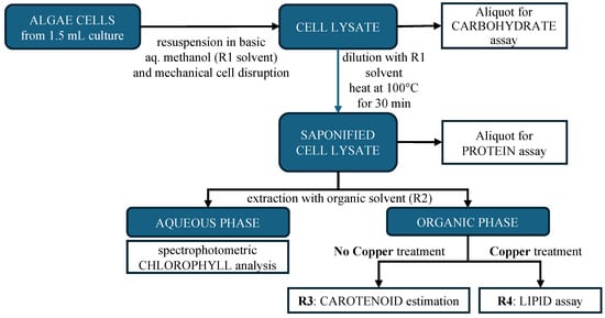 Compositional analysis of XB and AxB biomass was performed on actively growing algal cells using the extraction method of Chen and Vaidyanathan [] modified with assay procedures to estimate carbohydrate, protein, and lipid contents [,]. The extractive procedure and sample generation used for these studies is summarized in Figure 2. Initially, a 1.5 mL aliquot of algae culture (O.D. 0.5–1.5 at 540 nm) was centrifuged (3000 rpm, 5 min), and the pellet was redissolved in 0.02 mL phosphate buffer (50 mM, pH 7.0) and 0.48 mL of the R1 solvent (1M NaOH in 25% methanol). This basic cell suspension was subjected to bead milling for 14 min using a BeadBug 6 Homogenizer (Benchmark Scientific, Sayreville, NJ, USA), and aliquots of the lysate (0.2 mL) were set aside for carbohydrate analysis. The remaining lysate was diluted by addition of an additional 1 mL of R1 solvent, and the mixture was heated at 100 °C for a 30 min saponification. Aliquots removed after saponification were used for protein analysis. A 0.5 mL aliquot of the remaining lysate was transferred to a 2 mL tube containing 0.75 mL of the R2 solvent (chloroform/methanol, 2:1) for liquid–liquid separation of chlorophylls from lipids and carotenoids. The final organic phase from the R2 extraction was subjected to treatment with an equal volume of either TEA buffer (triethanolamine/acetic acid, 9:1) or Cu-TEA buffer (triethanolamine/acetic acid/6.25% Cu(NO3)2, 9:1:10) to produce the R3 and R4 samples, respectively, for each culture.