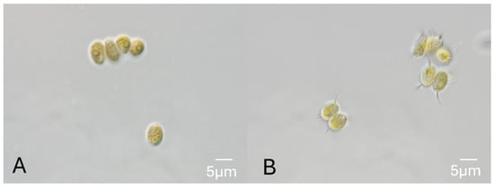 A microalga was isolated by enrichment from the largest of the San Antonio Springs, the Blue Hole, in San Antonio, Texas, and established as a xenic culture, designated XB. Iterative single-colony selection and subculturing from the XB culture produced an axenic isolate, AxB, which was used for unambiguous DNA profiling and morphology analysis by the UTEX Culture Collection. On microscopic examination using differential interference contrast (DIC), the axenic isolate, AxB, presented with green, ovoid cells about 5–7 µm long with prominent pyrenoids, occurring as both unicells and coenobia of two to four cells (Figure 3). The terminal cells of AxB coenobia from the liquid culture displayed prominent spines, but these spines were reduced or absent in the coenobia from the AxB culture grown on agar medium (Figure 3). These observations indicated that AxB has characteristics that are consistent with the morphology of Desmodesmus spp. The morphology of XB appeared similar to AxB during routine light microscopy observations but with slightly more 4-cell coenobia and fewer individual cells than AxB (Supplementary Figure S1). DNA profiling using the ITS1 and ITS2 rDNA sequences as previously described [] corroborated the morphology finding, indicating a high similarity (>99% identities) to strains of Desmodesmus spp. Phylogenetic tree construction using neighbor joining and maximum likelihood analyses (Figure 4) also indicated that the axenic isolate, AxB, is most closely related to strains of Desmodesmus sp.
