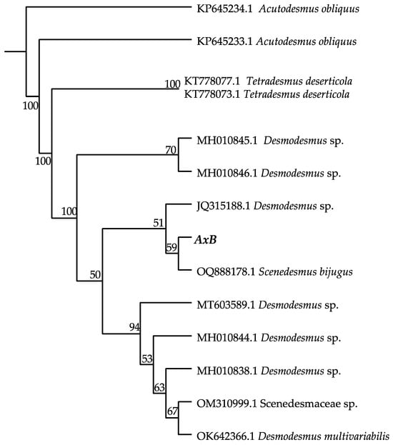 The axenic isolate, AxB, was submitted to the UTEX Culture Collection for genus-level identification through morphological examination and phylogenetic analysis of the internal transcribed spacer (ITS) rDNA according to their established methods [,]. Briefly, DNA was extracted from AxB culture using a manual disruption protocol and the detergent, dodecyltrimethylammonium bromide (DTAB) [], and PCR was performed using primers described by Goff [] to amplify the ITS1 and ITS2 rDNA regions. The PCR products were sequenced and used to generate a consensus sequence from three bidirectional sequence pairs using Geneious software (Geneious Prime® v2023.2.1, Build 20 July 2023 11:29). The obtained sequence was submitted to NCBI Blast analysis to determine its preliminary affiliation, and a phylogenetic tree was constructed through Maximum Likelihood and Neighbor Joining analyses using Geneious Prime 2023.2.1 with the Clustal Omega alignment tool and the Geneious Tree Builder plugin (Tamura-Nei nucleotide substitution model, (https://www.geneious.com). A Desmodesmus representative alga, KP645234.1 Acutodesmus obliquus, was selected as the root of the phylogenetic tree based on the identity of the nearest neighbor groups.