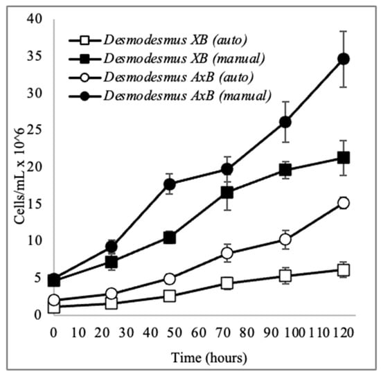 The specific growth rate and doubling times have been calculated for both the xenic and axenic cultures, Desmodesmus XB and Desmodesmus AxB, using an exponential growth period and procedures as described in Section 2.2 and Section 2.3 (Table 1). The cell density on Day 5 of the growth experiment is provided in Table 1 for reference and was determined using manual counting; however, culture densities were monitored for these experiments with both manual and automatic counting (Figure 5). Automatic quantitation of XB and AxB was observed to count coenobia as individual cells rather than as groups of cells, so both manual and automatic counting methods were used for comparison in growth experiments. Both fresh and dry weights of biomass produced by each culture were determined by harvesting growth cultures on the 5th day (Table 1).