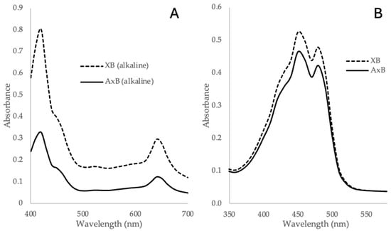 Chlorophylls and carotenoids were separated using the alkaline saponification method described in Section 2.5, and their estimated content in XB and AxB biomass is provided in Table 1 as calculated using the assumptions and extinction coefficients presented in Chen and Vaidyanathan []. Representative spectra for the chlorophyll fraction (aqueous phase after R2 extraction, Figure 2) and the carotenoid fraction (organic phase after R2 extraction, Figure 2) of Desmodesmus XB and Desmodesmus AxB are shown in Figure 6. As described by the authors of the method [], the alkaline conditions of the method converted the chlorophylls present to magnesium-rhodochlorins (Mg-RChls), which was necessary to make a more polar chlorophyll that partitioned to the aqueous phase but which also altered the absorption spectra of the chlorophyll requiring the determination of new extinction coefficients for chlorophylls a and b and the use of new equations to calculate chlorophyll content. For application of this method to a new alga with an unknown pigment profile, it was necessary to confirm the chlorophyll and carotenoid constituencies using one or more standard pigment analysis methods for confirmation. To verify the chlorophyll content determined using the alkaline extraction method, a standard extraction and assay method lacking alkaline saponification [] was used as described in Section 2.5, and the chlorophyll content derived from this assay is presented in Table 1 in brackets for XB and AxB. A comparison of the absorbance spectra for the two types of chlorophyll samples (alkaline method samples and standard method samples) derived from Desmodesmus XB and Desmodesmus AxB is provided in Supplementary Figure S2.