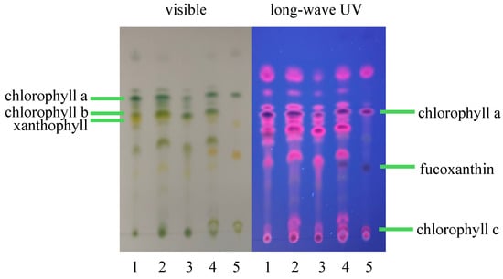 where Ca is chlorophyll a, Cb is chlorophyll b, and Ct is the total carotenoids (g/mL). The third extraction method was a modification of the second method involving the extraction of more culture (10 mL) to provide a more concentrated extract of chlorophylls and carotenoids for separation using thin-layer chromatography (TLC). In this method, 10 mL of algae culture (O.D. at 540 nm = 0.5–1.5) was extracted according to Wellburn [], then 0.010 mL of each of the resulting extracts was subjected to TLC using normal phase TLC plates with a hexane/acetone (7:3) running solvent in accordance with previous reported methods [,,]. Several reference algae, T. lutea, S. dimorphus, and P. mierengensis, were also extracted using this third method to provide chromatogram comparisons with known chlorophyll and carotenoid profiles [,,].