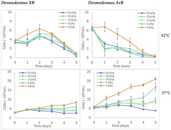 The growth of Desmodesmus XB and Desmodesmus AxB was examined at four different temperatures and four different saline levels using a 24-well plate growth model [] as described in Section 2.8 and summarized in Figure 8. Conditions were tested in quadruplicate wells for each isolate in BG-11 media with added NaCl at concentrations of 5, 10, 20, and 30 g/kg to test a range of salinities from weakly saline freshwater to almost marine levels. All saline and control (0 g/kg) media conditions were evaluated in separate experiments at temperatures specified in Figure 8 and Supplementary Figure S4. Cell densities were determined in these experiments by directly reading chlorophyll (Chl) fluorescence and correlating relative fluorescence to a manually counted cell number, as described in Section 2.2. The comparison of XB and AxB growth at different temperatures is depicted for the control (0 g/kg or no salt added) in Supplementary Figure S4 and as part of the saline media experiment results in Figure 8. Both isolates show an apparent growth preference for 25 °C with slower initial growth in 37 °C, slower growth overall at 15 °C, and significant die-off at 42 °C. As shown in Figure 8, the xenic isolate took longer to show loss of fluorescence at 42 °C than the axenic strain. In terms of their salt response, AxB exhibited a slightly higher sensitivity than XB to saline concentrations above 5 g/kg at all temperatures tested.