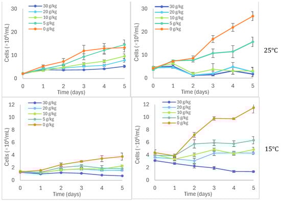 While optimal growing temperatures for most microalgal species range from 14 °C to 30 °C, microalgae that are promising for agricultural and environmental applications require robust growth at higher temperatures. High culture temperatures have been reported in outdoor raceway ponds and other industrial scale cultivations [,], and higher outdoor temperatures in growing locales such as Texas reflect higher soil temperatures that could impact the soil survival of applied microalgae. To determine whether XB and AxB would be more tolerant of higher temperatures as native Texas algae, growth of both isolates was observed at temperatures corresponding to the cooler temperatures of autumn and winter in Texas (15 °C); the standard laboratory temperature (25 °C); and the often-seen spring and summer temperatures in Texas, 37 °C and 42 °C, respectively. Surprisingly, both isolates were unable to withstand 42 °C (Figure 8), although a lag in decolorization was observed for XB that was not observed for AxB. At the other temperatures, XB and AxB had similar growth profiles with peak growth rates at 25 °C and slowest positive growth rates at 15 °C. Both XB and AxB demonstrated robust growth at 37 °C, which is outside the optimal growing temperature range and somewhat expected for an alga native to such a hot, dry climate. Higher temperature growth levels (42–45 °C) have been reported in other new microalgal isolates [,].