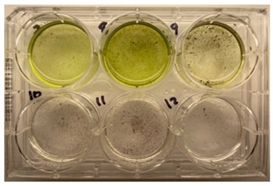 The short-term persistence of Desmodesmus XB in soil. The numbers on the plate represent pot numbers. The top row of wells contained soil dilution from pots amended with XB cells. The bottom row of wells contained soil dilution from pots amended with sterile filtered media from XB culture. The green color indicates regrowth of algae from the soil sample.