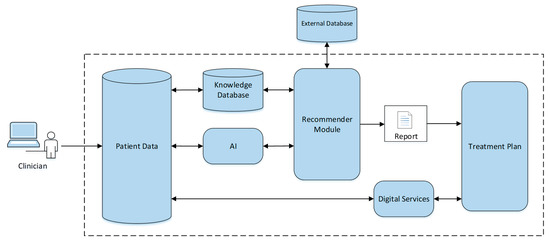 The DSS has several modules to support decision-making, including patient data, knowledge database, AI, recommender module, digital services, and treatment plan. The DSS generates a report using a recommendation engine that is based on either a knowledge base algorithm or AI. The treatment plan and digital services modules are used to support the functionality of the final step of the electronic healthcare record.
