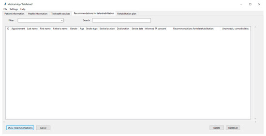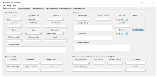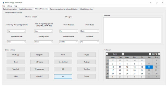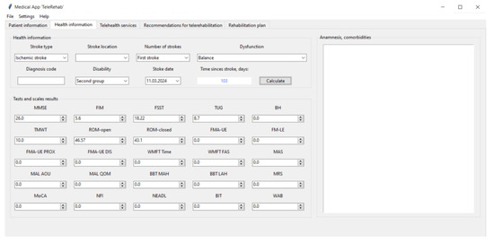 Figure 2, Figure 3, Figure 4 and Figure 5 show the graphical user interface (GUI) of the software. The GUI includes registration information, data on symptoms, physical and cognitive examinations, anamnesis, telehealth services, recommendations, and suggestions for TR. The GUI consists of typical IT components (menu and tabs, entry widgets, text widgets, labels, combo boxes, tree view, scrollbars, check buttons, buttons, etc.) to provide a user-friendly interface and functionality.
