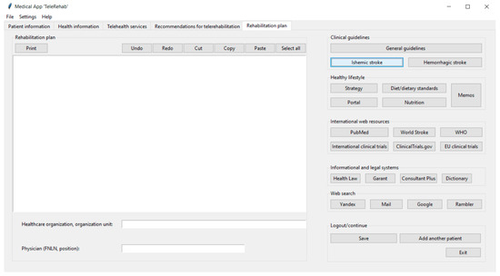 Finally, the fifth tab, “Rehabilitation plan”, is designed for treatment plan preparation. It contains the “Rehabilitation plan” frame with text and button widgets to type out, edit, and print out a treatment plan (Figure 6). The main text widget is required for writing the treatment plan. To process a hard copy of the treatment plan, the clinician can use the “Print” button to print it out. Additionally, there are five frames containing button widgets to assist therapists in making treatment plans and providing up-to-date recommendations using additional information (clinical guidelines, healthy lifestyles, international web resources, external informational and legal systems, and web search).