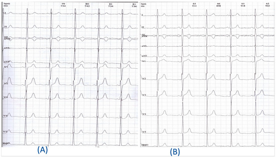 (A) Resting ECG: the patient’s ECG was recorded at the moment that the patient complained of chest pain (25 mm/s, 10 mm/1 mV). (B) ECG performed one year after the surgical intervention (ECG = electrocardiogram).