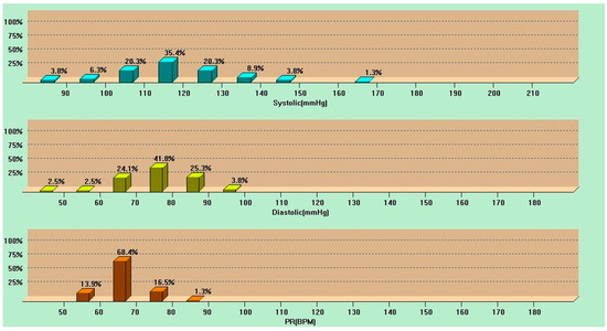 Ambulatory blood pressure monitoring over 24 h (X-axis shows blood pressure values and the Y-axis shows the percentage of time within the X-axis blood pressure value (upper part systolic blood pressure and middle part diastolic blood pressure). X-axis shows pulse rate values in beats per minute (BPM) and the Y-axis shows the percentage of time within the X-axis pulse rate (lower)).