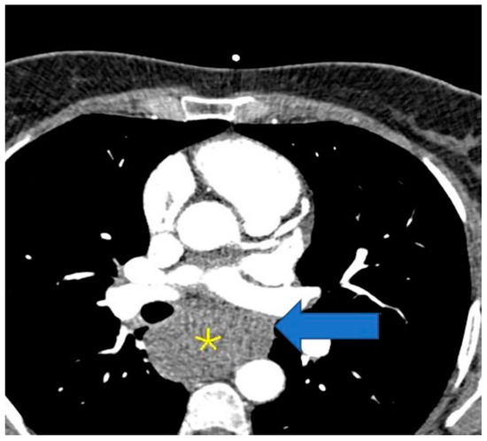 CT thorax with contrast (for coronary angiography) showing a solid mass enveloping the esophagus (yellow star).
