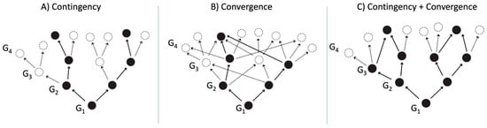 (Panel A) represents contingency outcomes starting from Generation 1 (G1) (a single point of origin) to G4. The two black circles at G4 indicate the ‘final’ destinations that have gone through different paths through G2 and G3, chosen from various possibilities, as a result of contingency occurring in one or more generations (dashed empty circles). On the other hand, (Panel B) illustrates a convergent outcome. Despite starting from a single point of origin at G1 and passing through different points at G2 and G3, the final outcome arrives at the single point (G4). In contrast, (Panel C) indicates a combination of contingency and convergence. Modified from [].