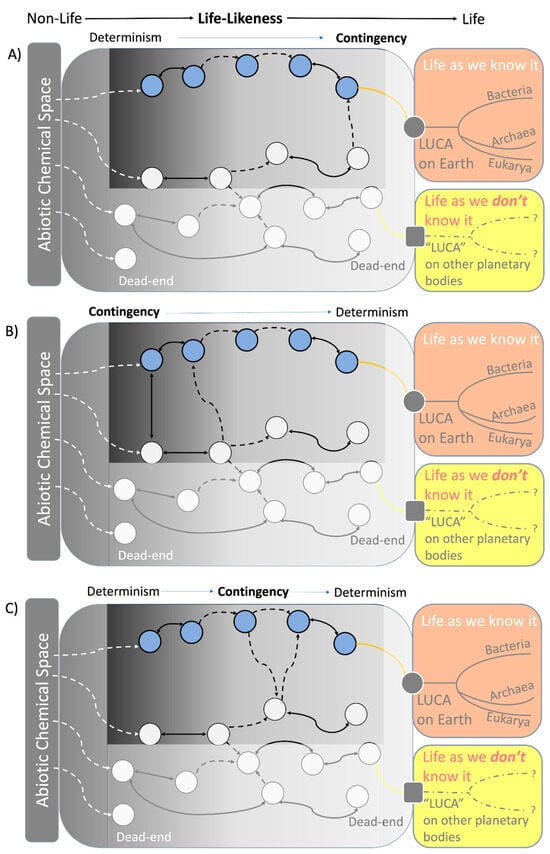 On a separate note, the binary distinction between deterministic OoL (shown in Figure 2A) and contingent OoL (shown in Figure 2B) could present a false dichotomy by presenting two options as the only possible choices, ignoring other viable alternatives. Such alternatives include the likelihood of a spectrum between determinism and contingency (Figure 3A,B), or an intermixing of both (Figure 3C). This phenomenon may not only apply to the OoL on Earth but also to the OoL of ET elsewhere.