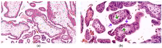 First-trimester chorionic villi in hematoxylin–eosin (HE) staining: (a) 200×, mesenchymal villi, with diffuse stromal structure, containing thin collagen and reticulin fibers (black arrows), fibroblasts (blue arrows), scarce Hofbauer macrophages (yellow arrows), and rare fetal blood vessels (red arrows) encased within a peripheral trophoblastic epithelium, comprised of a well-defined cytotrophoblastic layer internally (green arrows), and a relatively thick, syncytiotrophoblastic layer externally (purple arrows); (b) 400×, villous sprouts and details regarding cellular morphology of cytotrophoblasts (green arrows) and syncytiotrophoblast (purple arrows).
