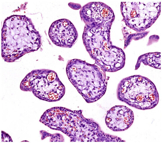 Figure 2. Chorionic villi in hematoxylin–eosin (HE) staining (400×), demonstrating chorangiosis and accelerated villous maturation seen only in spontaneous abortion cases. - Syncytial knotting: Ranging from sporadic and slightly increased in elective abortions (see Figure 1) to more extensively apparent in spontaneous abortion samples (see Figure 3B,E).