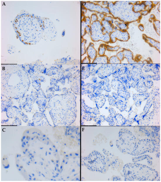 Figure 3. Targeted immunohistochemistry staining patterns encountered in chorionic villi from first-trimester fetal placentas: (A) 400×, increased, high intensity, trophoblastic nuclear reactivity; (B) 200×, low density, moderate intensity, trophoblastic nuclear positivity; (C) 400×, detail of negative chorionic villus; (D) 200×, high density, high intensity, trophoblastic cytoplasmic positivity; (E) 200×, very isolated, low-intensity, nuclear reactivity; (F) 200×, negative/control slide.