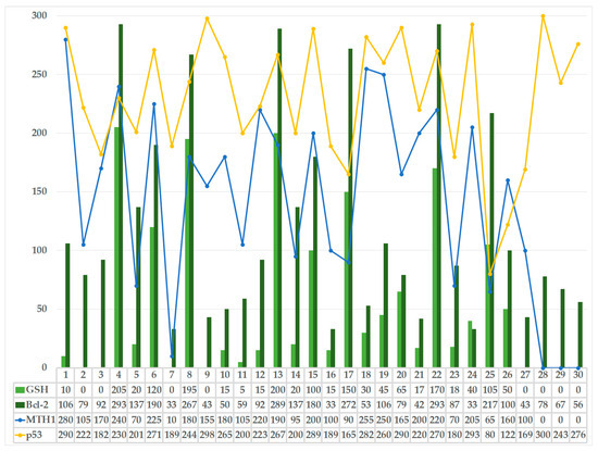 In evaluating the variability of the GSH and MTH1 parameters, it is noteworthy that the results have a very high statistical value (p < 0.0001). The mean difference between the two evaluations is 98.33, with the average value of MTH1 being higher compared to the average value of GSH. Although these immuno-markers are involved in the OS mechanism as preventive antioxidant and protective response elements, they do not vary linearly.