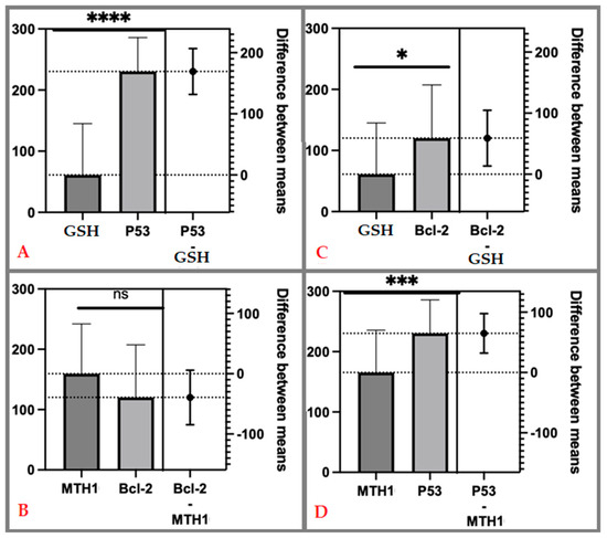 Paired comparison between expression of immunohistochemistry targets, i.e., p53—tumor protein p53; Bcl-2—B-cell lymphoma-2 protein; GSH—glutathione; MTH1—MutT Homolog 1 protein, within the spontaneous abortion study group: (A) difference between means for p53 vs. GSH; (B) difference between means for Bcl-2 vs. MTH1; (C) difference between means for Bcl-2 vs. GSH; (D) difference between means for p53 vs. MTH1. ns = non-significant. The power of statistical significance was marked on the charts with asterisks, with the number of asterisks directly parallel to the statistical power.