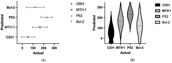 Representation of normality test results for the compared values (P53—tumor protein p53; Bcl-2—B-cell lymphoma-2 protein; GSH—glutathione; MTH1—MutT Homolog 1 protein), namely (a) predictive; (b) Gaussian dispersion.