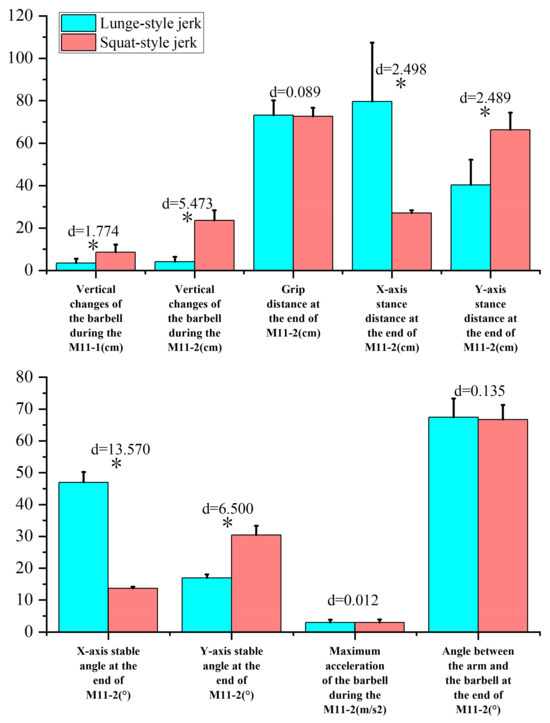 There are significant differences in the vertical changes in the barbell during the squat shoulder locking phase and active supporting phase (Figure 3). In the squat shoulder locking stage (M11-1), the vertical change in the barbell for the lunge-style jerk was 3.49 cm, which was 5.06 cm less than that for the squat-style jerk, representing a statistically significant difference (t = −5.42, p < 0.05, ES = 1.774). In the active supporting phase (M11-2), the vertical change in the barbell for the lunge-style jerk was 4.12 cm, which was 19.48 cm less than that for the squat-style jerk, displaying a statistically significant difference (t = −16.562, p < 0.05, ES = 5.473). At the end of the active supporting phase, the X-axis stance distance of the lunge-style jerk was 52.51 cm larger than that of the squat-style jerk (t = 19.086, p < 0.05, ES = 2.498), while the Y-axis stance distance of the former was 25.98 cm smaller than that of the latter (t = −7.700, p < 0.05, ES = 2.489). The X-axis stable angle of the former was 33.35° larger than that of the latter (t = 45.639, p < 0.05, ES = 13.570), while the Y-axis stable angle of the former was 13.49° smaller than that of the latter (t = −19.47, p < 0.05, ES = 6.500). There were no statistically significant differences in the grip distance, the angle between the arm and barbell at the end of the squat-supporting phase, or the maximum acceleration of the barbell during the M11-2 stage between the lunge-style jerk and squat-style jerk.