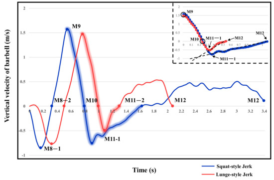 Changes in the vertical velocity of the barbell in successful attempts of the lunge-style and squat-style jerks.