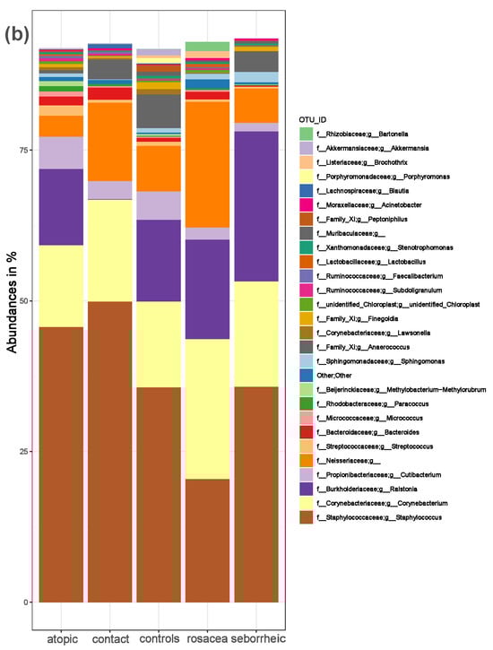 The composition of the skin microbiota in PD patients and healthy controls. (a) Relative abundance at the phylum and (b) at the genus level for healthy controls and patients with atopic dermatitis, contact dermatitis, rosacea, and seborrheic dermatitis.