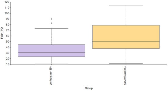 Alpha diversity comparison between the healthy controls and PD patients. Faith’s PD index revealed a statistically significant difference (p = 0.004).