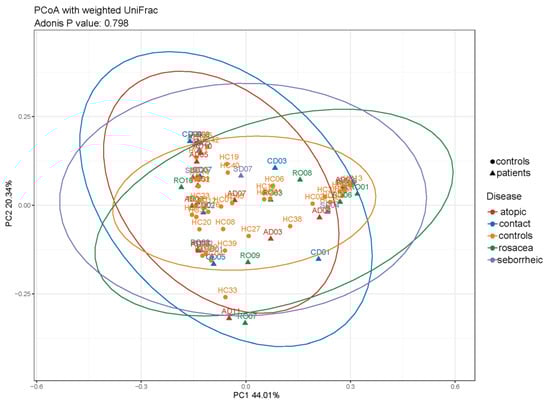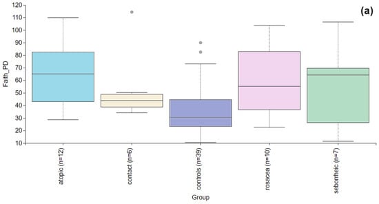 Our results, based on the Faith’s PD alpha diversity index, revealed differences in biodiversity within samples of healthy individuals and those with PD. Using three additional indices, we observed a trend toward reduced biodiversity in patients with atopic dermatitis, seborrheic dermatitis, and rosacea. This finding is consistent with the larger study conducted by Edslev et al. [34]. Meanwhile, patients with contact dermatitis showed a subtle trend toward increased biodiversity. Higher Faith’s PD index values observed in patients with PD indicate the presence of phylogenetically distant bacteria in their samples. This, along with the decrease in Shannon index, may suggest a low abundance of these diverse bacteria.