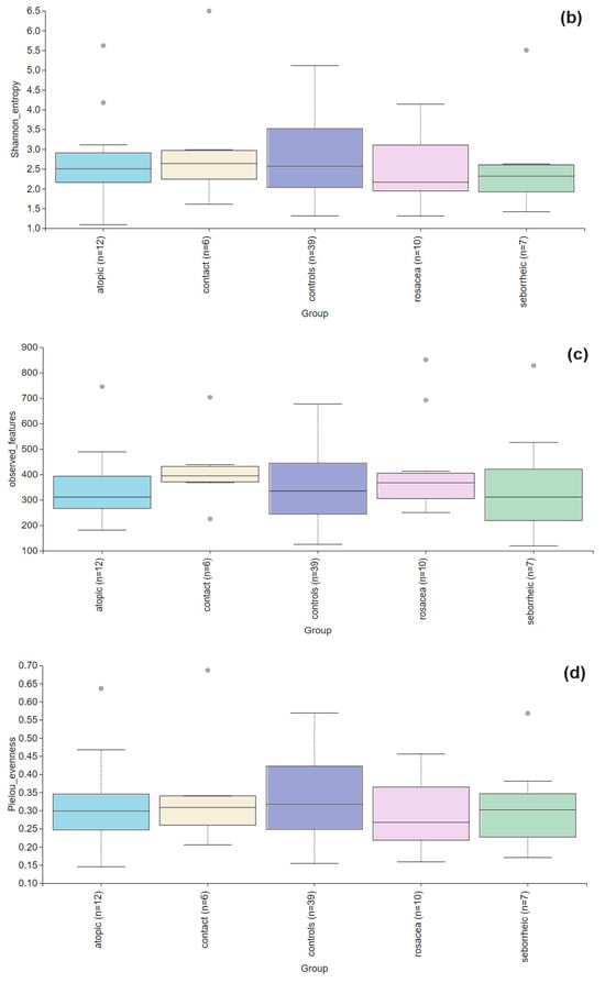 Alpha diversity comparison between the healthy controls and PD patients with atopic dermatitis, contact dermatitis, rosacea, and seborrheic dermatitis. (a) The Faith’s PD index showed a statistically significant difference in atopic dermatitis (p < 0.001) and rosacea (p = 0.013), while in contact dermatitis (p = 0.066) and seborrheic dermatitis (p = 0.278) there were no significant differences. (b) Shannon entropy index showed no significant differences between the healthy controls and PD patients with atopic dermatitis (p = 0.756), contact dermatitis (p = 0.947), rosacea (p = 0.472), and seborrheic dermatitis (p= 0.436). (c) Observed features index showed no significant differences between the healthy controls and PD patients with atopic dermatitis (p = 0.929), contact dermatitis (p = 0.256), rosacea (p = 0.315), and seborrheic dermatitis (p = 0.680). (d) Pielou evenness was similar across healthy controls and PD subgroups with no significant differences observed for atopic dermatitis (p = 0.641), contact dermatitis (p = 0.949), rosacea (p = 0.224), seborrheic dermatitis (p = 0.491).
