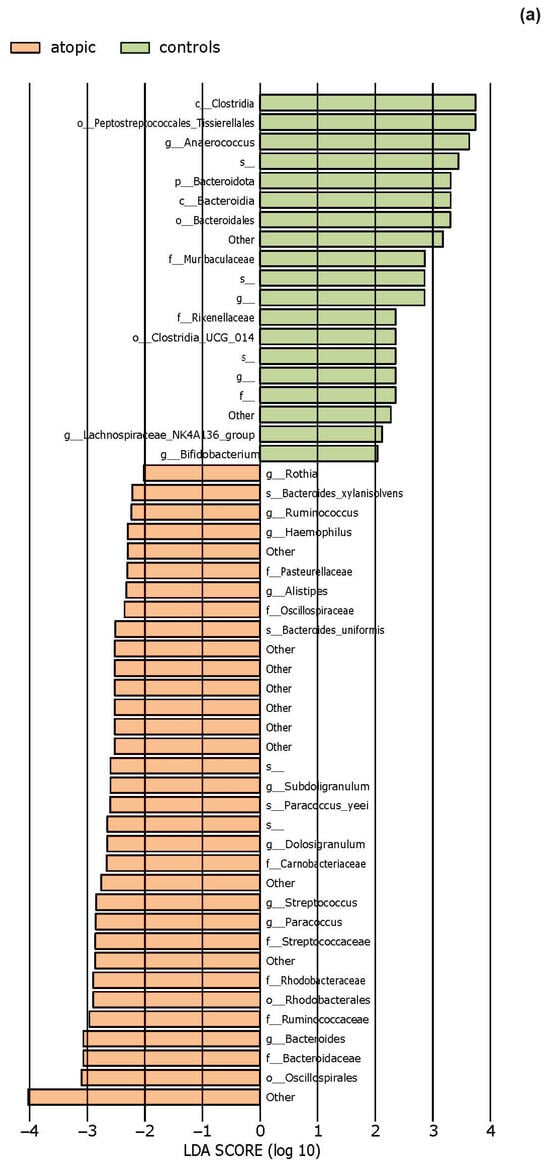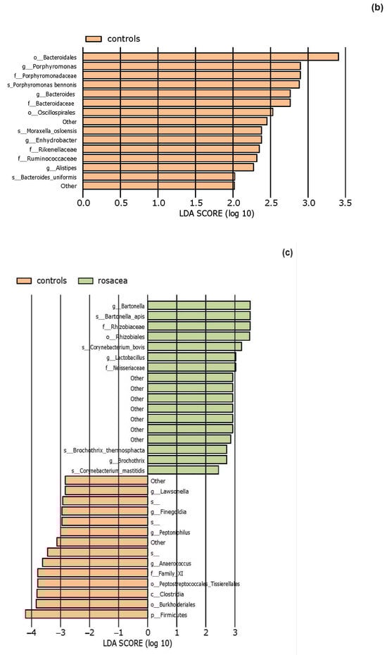 The effect size of linear discriminant analysis (LDA) was used to identify key bacterial groups, with LDA scores greater than 2 being considered significant, as shown in Figure 5. The LEfSe analysis revealed that certain bacteria of the skin microbiota were significantly more or less abundant in the examined groups compared to healthy controls across various taxonomic levels. These bacteria could potentially serve as biomarkers for the investigated diseases.