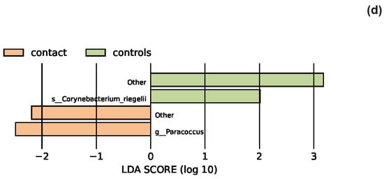 The LEfSe analysis highlighted the potential bacterial biomarkers. (a) In patients with atopic dermatitis, bacteria from various genera, including Rothia, were significantly more abundant, whereas those from genera Anaerococcus and Bifidobacterium were significantly decreased compared to controls. (b) In patients with seborrheic dermatitis, there was a significant decrease in the abundance of the genera Bacteroides, Porphyromonas, Enhydrobacter, and Alistipes. (c) In patients with rosacea, there was a significant increase in the abundance of the genus Bartonella, as well as Corynebacterium bovis and C. mastitidis, along with a decrease in the abundance of the genera Anaerococcus and Finegoldia. (d) In patients with contact dermatitis, the genus Paracoccus was significantly more abundant, while C. bovis was less abundant compared to controls.