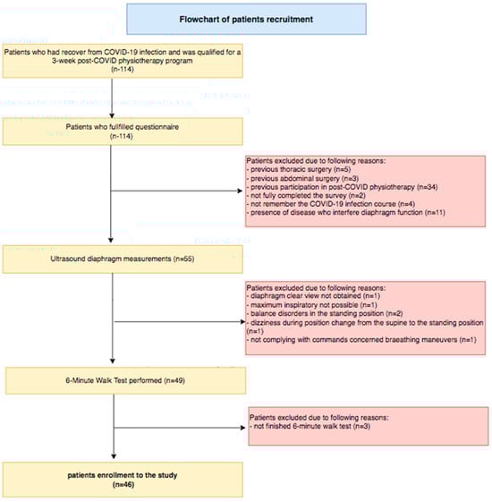 Patients were eligible for enrollment if they had at least one symptom during the infection course (coughing, fever, dyspnea, and loss of smell or taste) and if SARS-CoV-2 infection was confirmed by a RT-PCR (real-time reverse polymerase chain reaction) test of nasopharyngeal swabs. Participants were excluded from analysis for one or more of the following reasons: previous thoracic or abdominal surgery, presence of a disease that interferes with diaphragm function, previous participation in post-COVID rehabilitation, difficulty obtaining a clear view of the diaphragm upon ultrasound imaging, not complying with commands concerning breathing maneuvers during examination, presence of balance disorders that impeded ultrasound measurements in a standing position, or inability to participate in or finish the 6-min walk test.