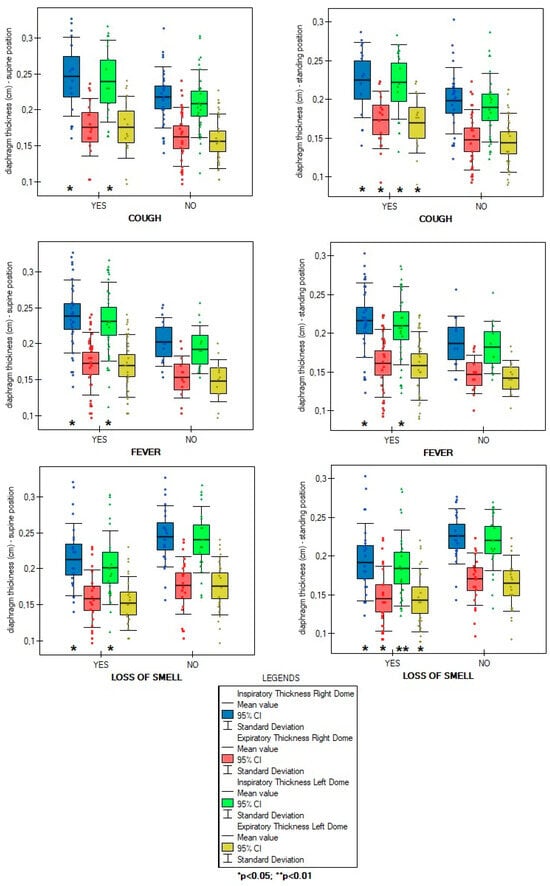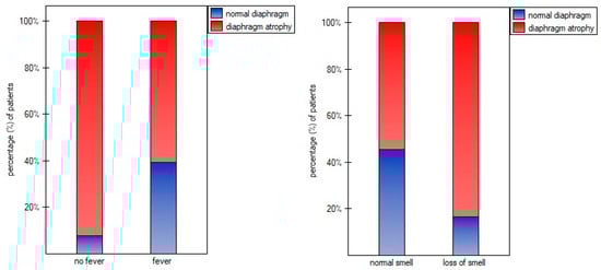 The overall number of symptoms during infection was not correlated with diaphragm function parameters in supine (ThIns: r = 0.003, p = 0.981; ThEx: r = 0.104, p = 0.488; DTF: r = −0.143, p = 0.345; DTR: r = −0.144, p = 0.338) and standing positions (ThIns: r = −0.023, p = 0.8798; ThExp: r = 0.072, p = 0.631; DTF: r = −0.140, p = 0.357; DTR: r = −0.144, p = 0.338). Of all analyzed disease symptoms, only patients with the presence of cough, fever, and without loss of smell over the COVID-19 course had significantly greater values of diaphragm inspiratory thickness in supine position, as well as greater inspiratory and expiratory thickness in standing position, compared to participants without the abovementioned symptoms (Figure 2). Furthermore, as shown in Figure 3, we found a significantly lower percentage of diaphragm atrophy among participants with fever (p = 0.0353) and without smell disorders (0.0340).