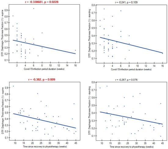 Mild and moderate severity of COVID-19 disease did not differentiate participants in terms of atrophy risk (mild: 66.6%; moderate: 70.9%; p = 0.782), supine diaphragm ultrasound measurements (ThIns: p = 0.684; ThExp: p = 0.956; DTF: p = 0.727; DTR: p = 0.482), and standing diaphragm ultrasound measurements (ThIns: p = 0.597; ThExp: p = 0.924; DTF: p = 0.365; DTR: p = 0.424). There were also no relationships between time of infection duration and diaphragm thickness in both supine (ThIns: r = 0.022, p = 0.880; ThExp: r = 0.151, p = 0.314) and standing positions (ThIns: r = −0.087, p = 0.563; ThExp: r = 0.002, p = 0.986). Likewise, time since recovery showed no association with muscle thickness at supine (ThIns: r = −0.167, p = 0.266; ThExp: r = 0.019, p = 0.899) and standing (ThIns: r = −0.190, p = 0.205; ThExp: r = −0.056, p = 0.707). In contrast, both variables had an impact on values of the DTF index (Figure 4).