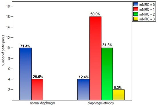 In our study, almost 85% of post-COVID-19 patients that qualified for the physiotherapy program had at least one sonographic abnormality of diaphragm muscle function. These finding are consistent with a previous study conducted by Farr et al. []. The vast majority of these dysfunctions were atrophy (69.5%), unlike the other viral diseases described in the literature that caused diaphragm paralysis [,,,,,,]. The impact of diaphragm muscle thinning was particularly evident in the degree of disability that breathlessness posed on day-to-day activities. A significantly higher percentage of patients classified their objectively perceived respiratory disability in the first, second, or third class of dyspnea on the mMRC scale, compared to patients with a normal muscle cross-section (Figure 5). The reduction in diaphragm muscle mass also resulted in higher exertion and dyspnea after the 6-min walk test compared to non-atrophic patients.