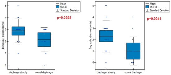 Diaphragm muscle atrophy strongly contributed (p = 0.0005) to functional dyspnea during activities of daily living, measured on the mMRC scale (Figure 6). This was also evident in the higher points obtained on the Borg scale in participants with an atrophic diaphragm compared to subjects without dysfunction (Figure 7).