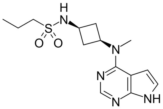 - Vazquez, M.L.; Kaila, N.; Strohbach, J.W.; Trzupek, J.D.; Brown, M.F.; Flanagan, M.E.; Mitton-Fry, M.J.; Johnson, T.A.; TenBrink, R.E.; Arnold, E.P.; et al. Identification of N-{cis-3-[Methyl(7H-pyrrolo[2,3-d]pyrimidin-4-yl)amino] cyclobutyl}propane-1-sulfonamide (PF-04965842): A selective JAK1 clinical candidate for the treatment of autoimmune diseases. J. Med. Chem. 2018, 61, 1130–1152. [Google Scholar] [CrossRef]