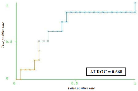 The ANN model for predicting pre-diagnostic depression with all attributes included was built with a learning rate of 0.4, a momentum of 0.6, 1000 epochs, and half of the sum of attributes and classes as the number of neurons in the hidden layer. The model with selected attributes had the following parameters: a learning rate of 0.4, a momentum of 0.6, 1000 epochs, 7 neurons in the first hidden layer, and 5 neurons in the second hidden layer (Figure 1). Attribute selection using correlation of attributes with the predicted class yielded seven variables relevant for predicting pre-diagnostic depression: HADS depression score, HADS anxiety score, POSM Worry score, CDDQ score for concern about health consequences, use of sedatives, induced abortion, and spontaneous abortion (Table 2). Selecting attributes that correlate with the class (predicted outcome) enabled the creation of a model with higher accuracy compared to that with the entire set of attributes. The model for predicting pre-diagnostic depression had a sensitivity of 70.6% and a specificity of 47.7% (Table 3). The AUROC value that the model achieved was 0.668 (Figure 2).